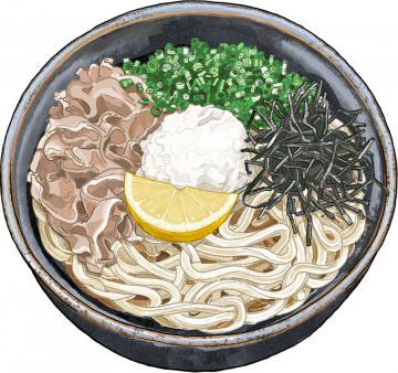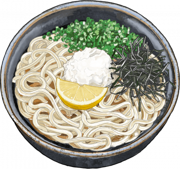 粗めの大根おろしがのった、汁なしのうどん。専用のだししょうゆを好みの量かけて食べる。