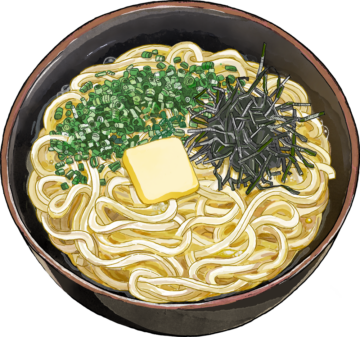 バター入りの釜玉うどん。専用のだししょうゆを好みの量かけて食べる。