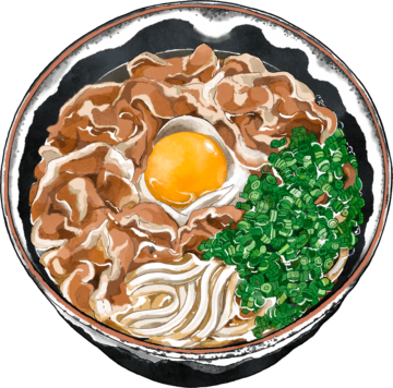 肉うどん。甘からく煮られた肉はとても柔らかい。