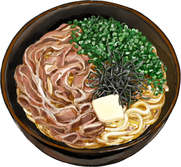肉のせ、バター入りの釜玉うどん。専用のだししょうゆを好みの量かけて食べる。